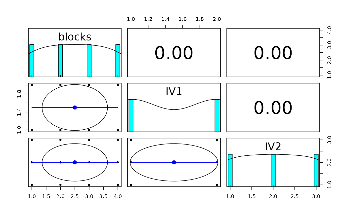 A matrix of subject numbers, block number, and randomized levels for each IV