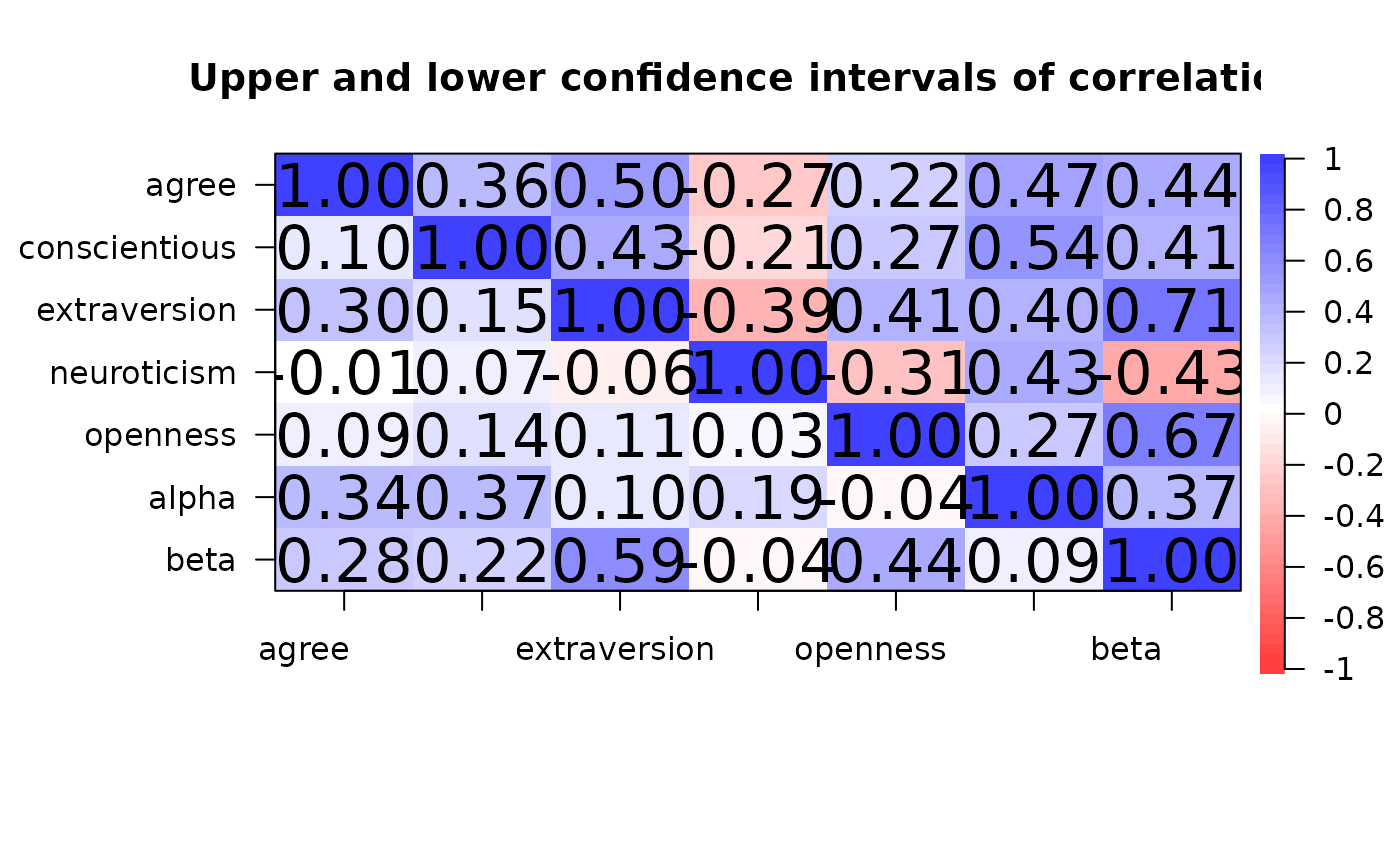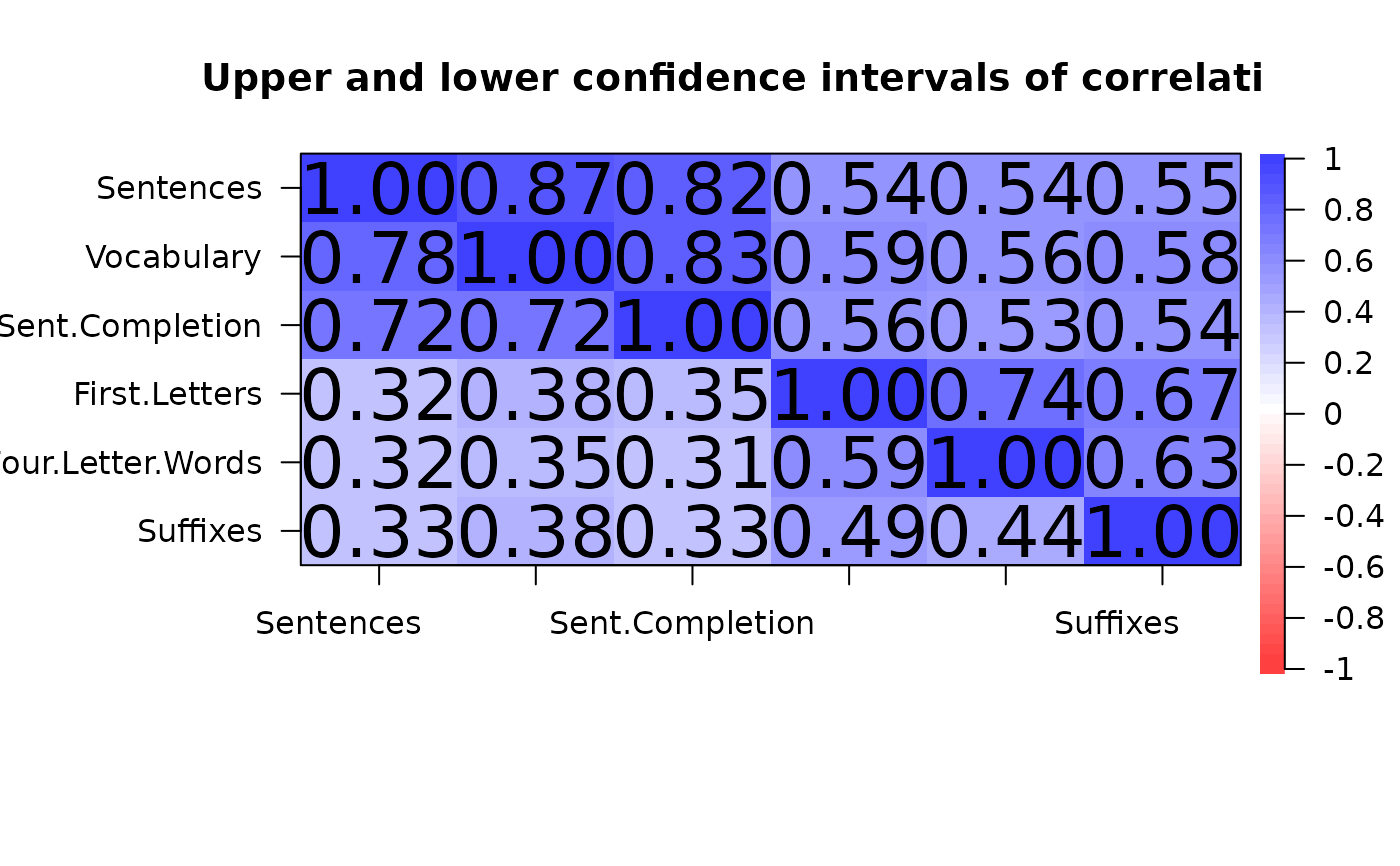 R <- cor.plot.upperLowerCi(ci) #show them graphically