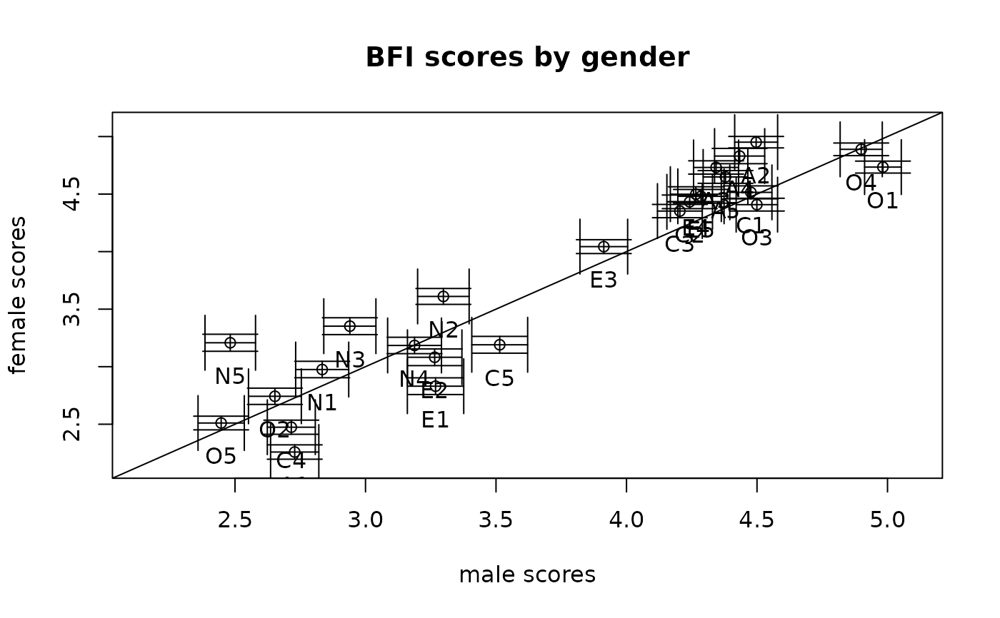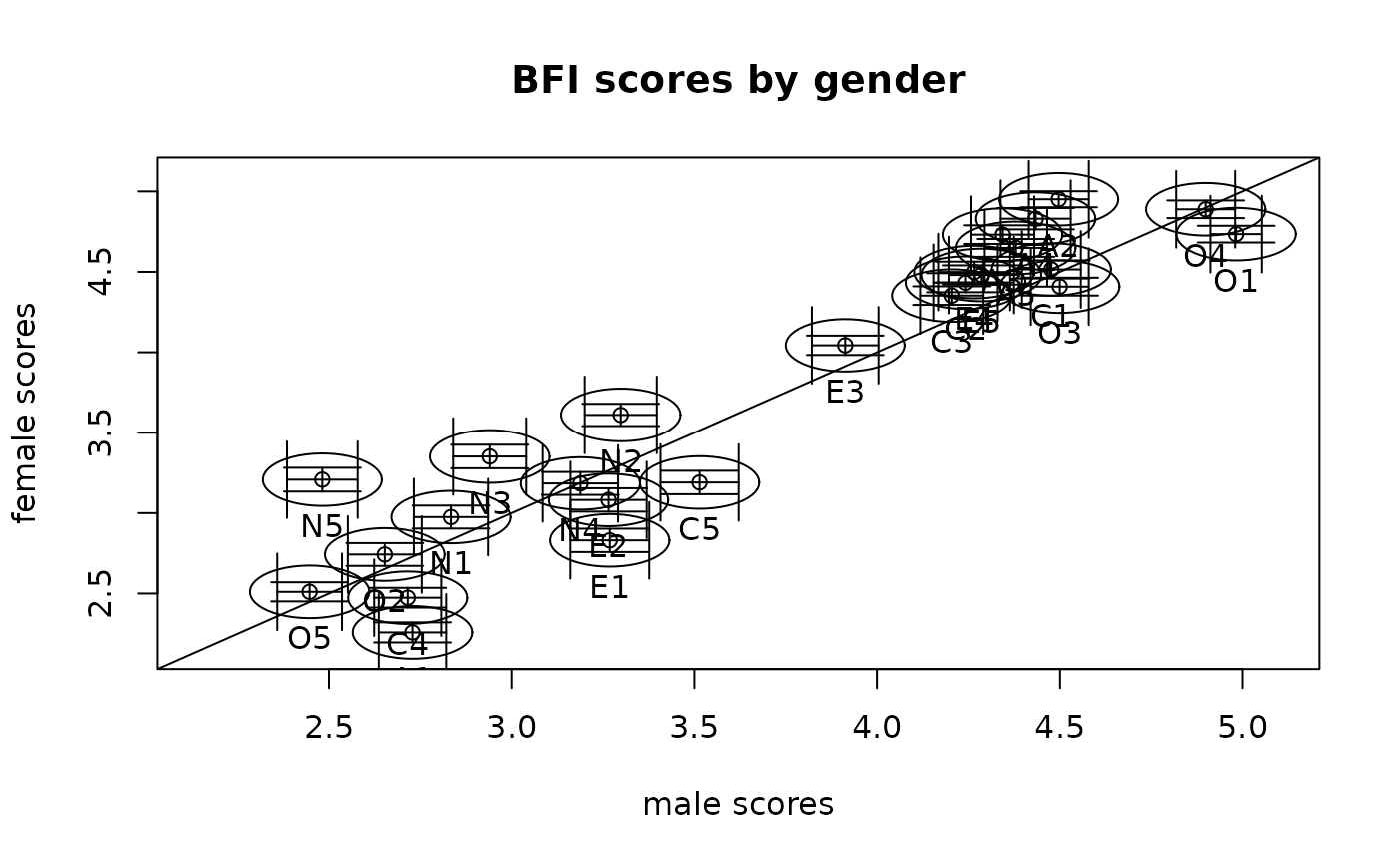 errorCircles(1:25,1:25,data=bfi,group="gender",paired=TRUE,circles=FALSE,