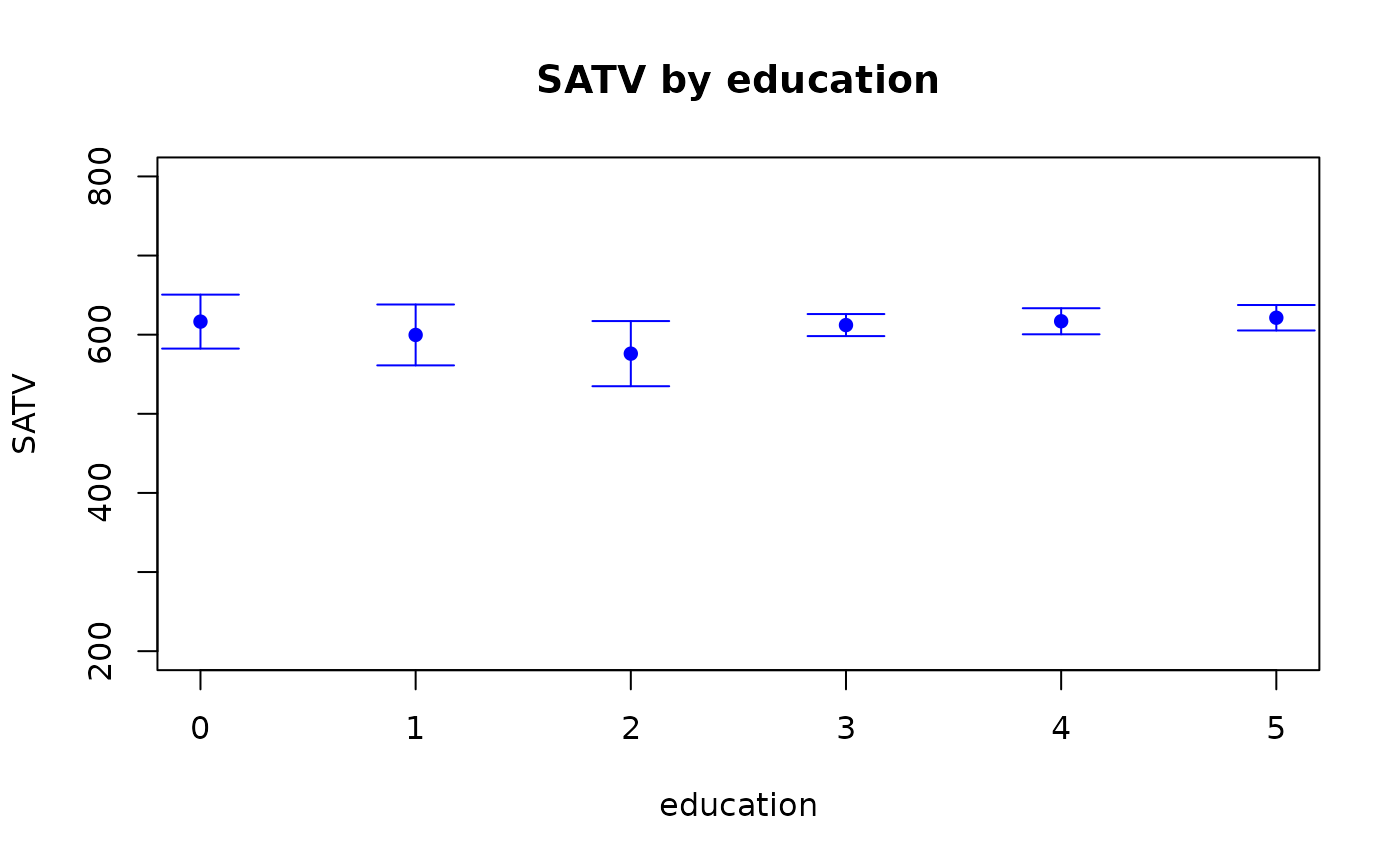 ylim= c(200,800),main="SATV by education",labels="")