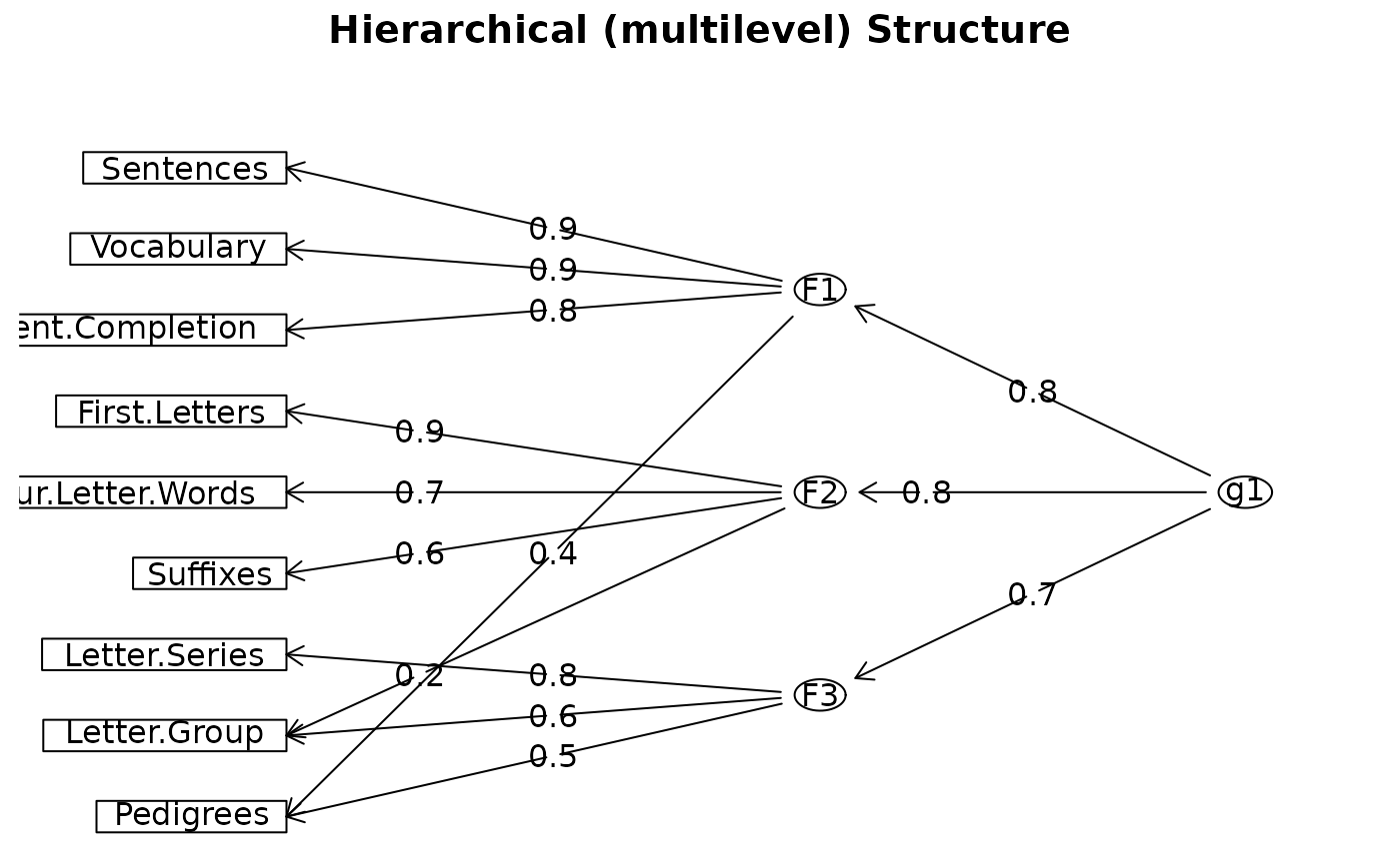 fa.multi(r, nfactors = 3, nfact2 = 1, n.obs = NA, n.iter = 1, rotate = "oblimin",