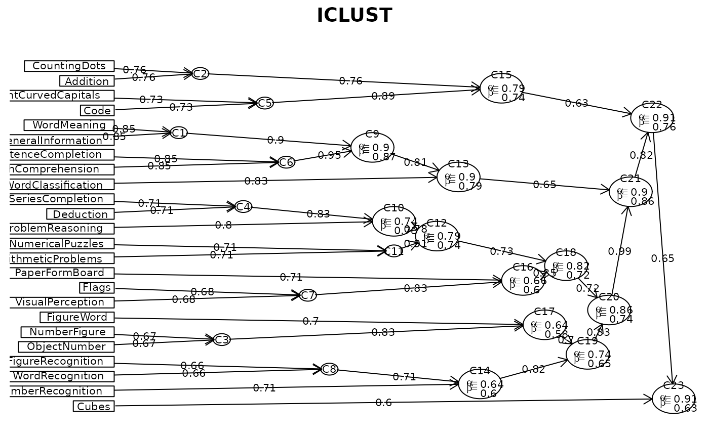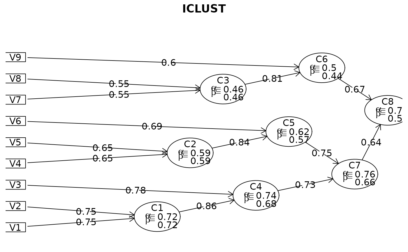 iclust.diagram.RdGiven a cluster structure determined by ICLUST, create a graphic structural diagram using graphic functions in the psych package To create dot code to describe the ICLUST output with more precision, use ICLUST.graph. If Rgraphviz has been successfully installed, the alternative is to use ICLUST.rgraph.