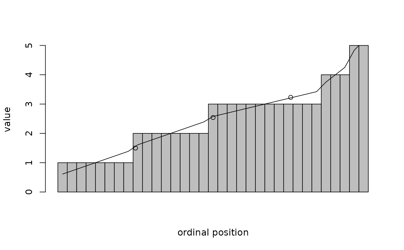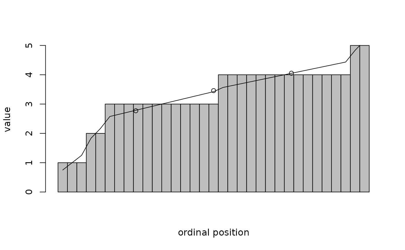 points(c(length(x)/4,length(x)/2,3*length(x)/4),interp.quartiles(x))