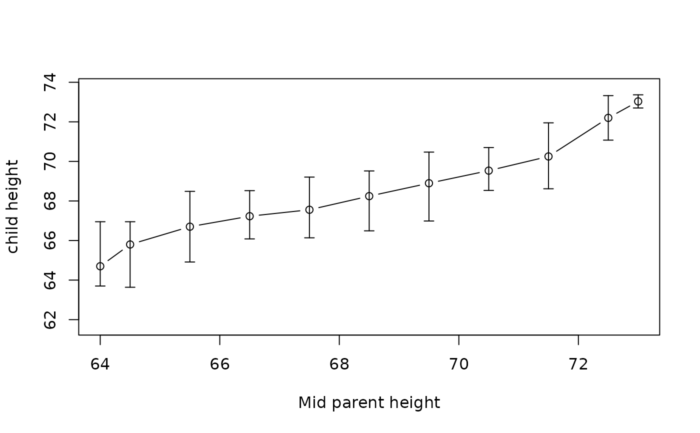 interp.qplot.by(galton$child,galton$parent,ylab="child height"