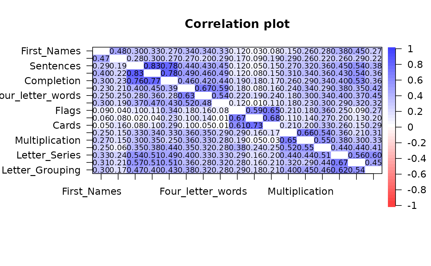 lowerUpper.RdWhen reporting correlation matrices for two samples (e.g., males and females), it is convenient to show them as one matrix, with entries below the diagonal representing one matrix, and entries above the diagonal the other matrix. It is also useful to compare a correlation matrix with the residuals from a fitted (e.g., factor) model.