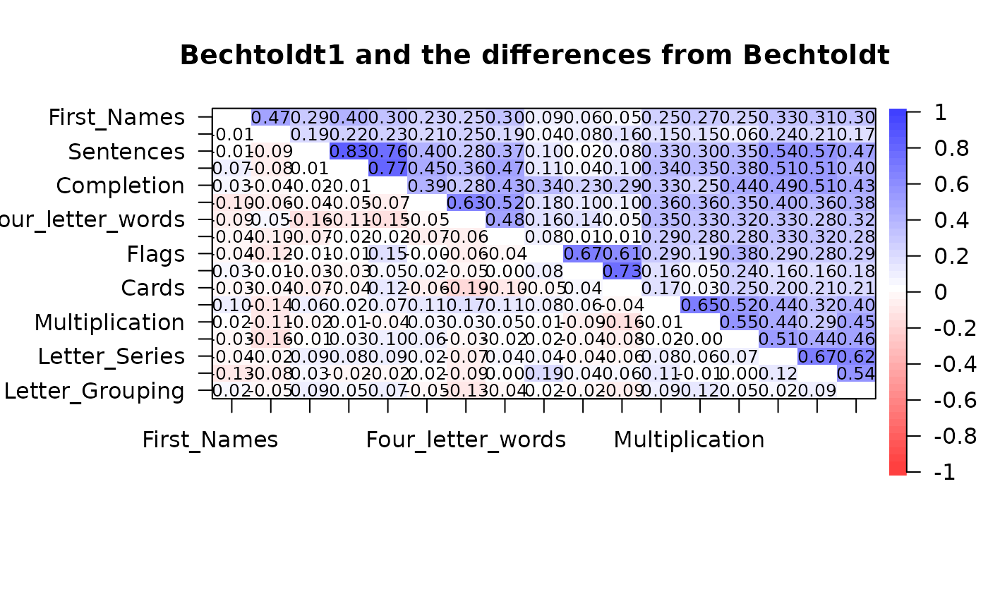 corPlot(t(diff12),numbers=TRUE,main="Bechtoldt1 and the differences from Bechtoldt2")