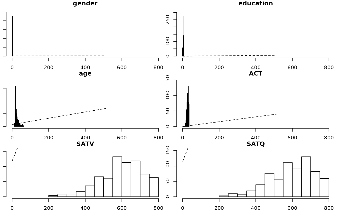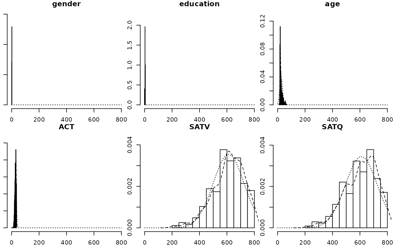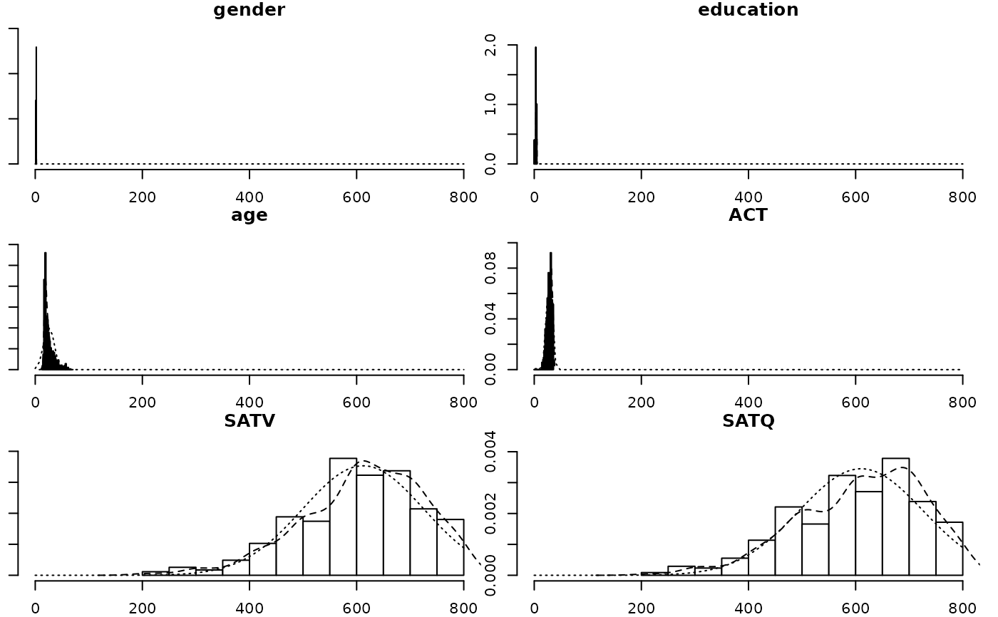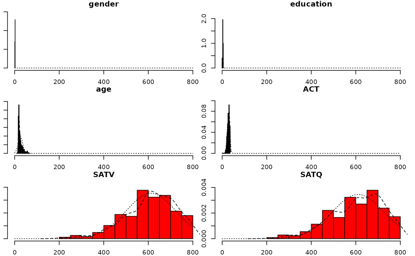 multi.hist(sat.act,dcol= c("blue","red"),dlty=c("dotted", "solid"))