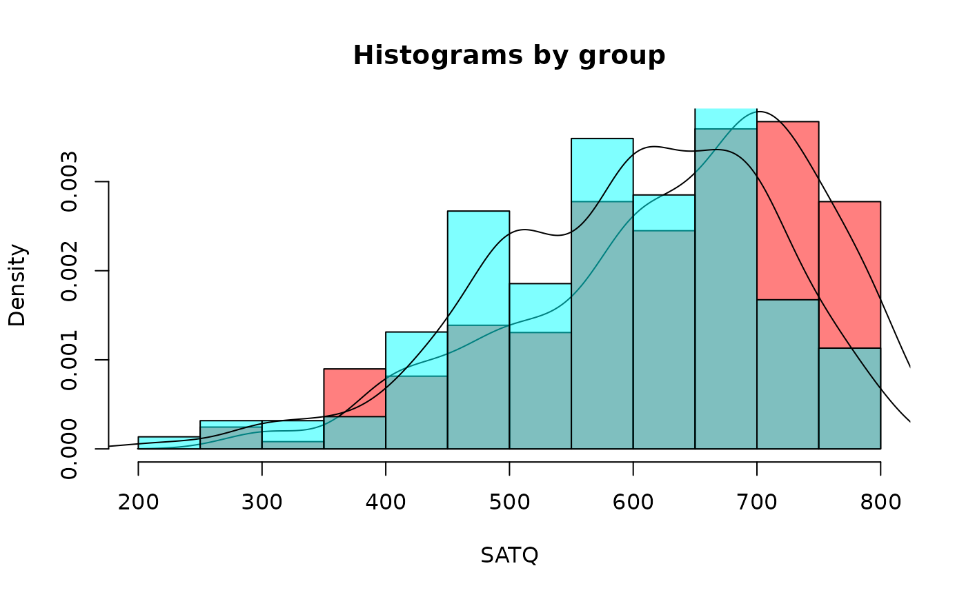 histBy(SATQ~ gender, data=sat.act) #formula input