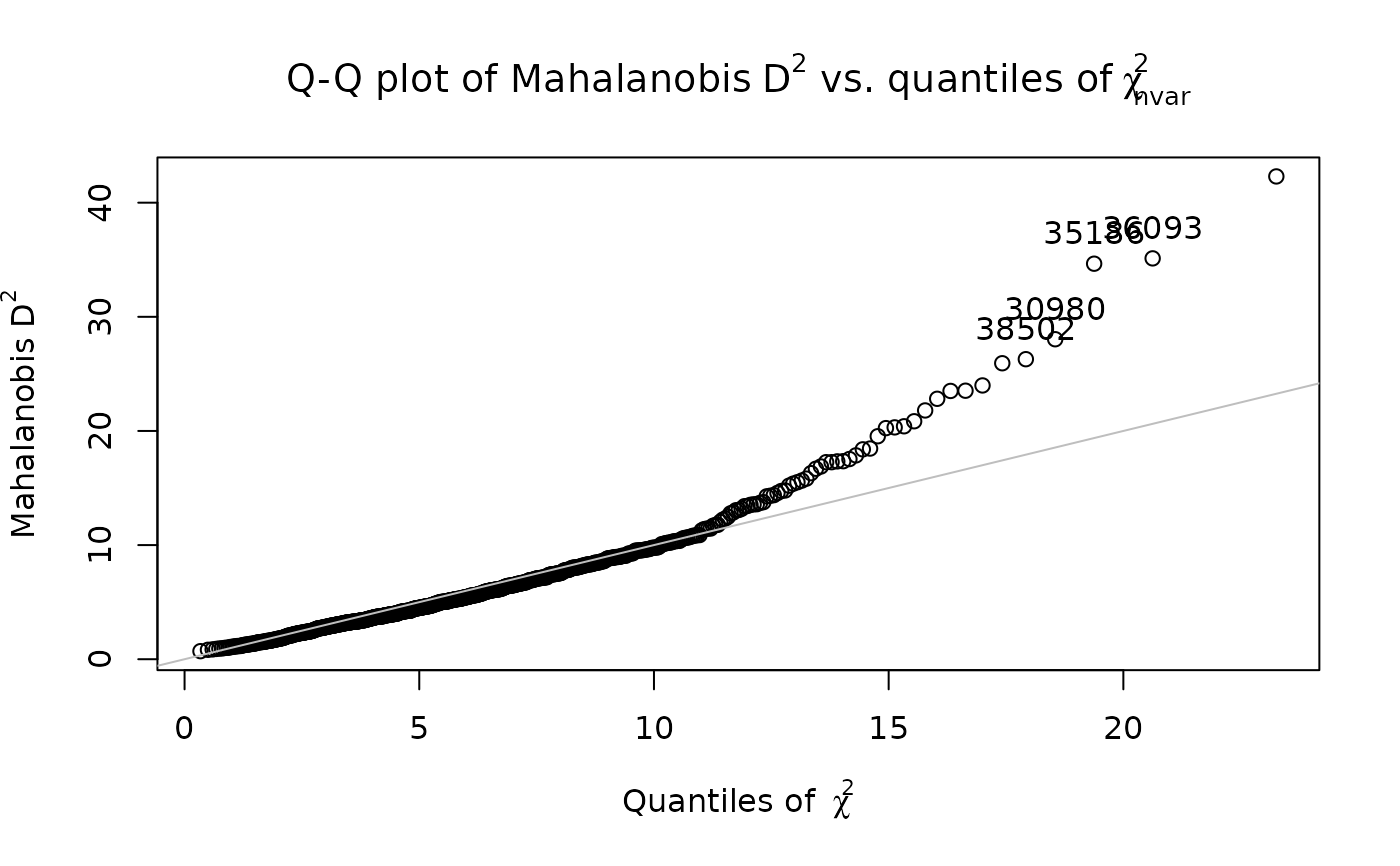outlier.RdThe Mahalanobis distance is \(D^2 = (x-\mu)' \Sigma^-1 (x-\mu)\) where \(\Sigma\) is the covariance of the x matrix. D2 may be used as a way of detecting outliers in distribution. Large D2 values, compared to the expected Chi Square values indicate an unusual response pattern. The mahalanobis function in stats does not handle missing data.