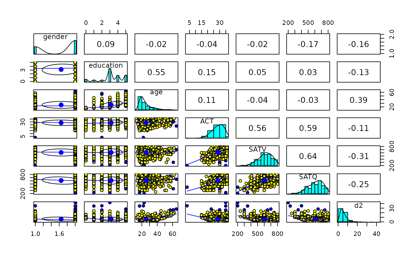 pairs.panels(sat.d2,bg=c("yellow","blue")[(d2 > 25)+1],pch=21)