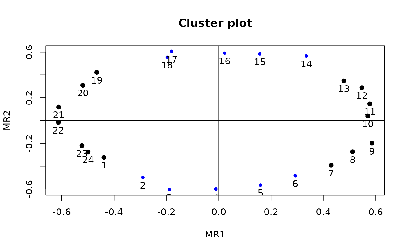 polar(f, sort = TRUE)Although many uses of factor analysis/cluster analysis assume a simple structure where items have one and only one large loading, some domains such as personality or affect items have a more complex structure and some items have high loadings on two factors. (These items are said to have complexity 2, see VSS). By expressing the factor loadings in polar coordinates, this structure is more readily perceived.