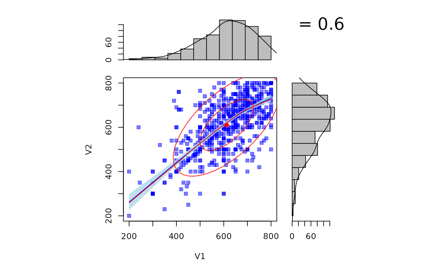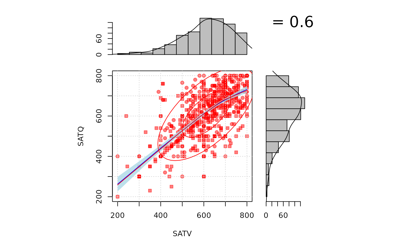 scatterHist(SATV ~ SATQ,data=sat.act) #formula input