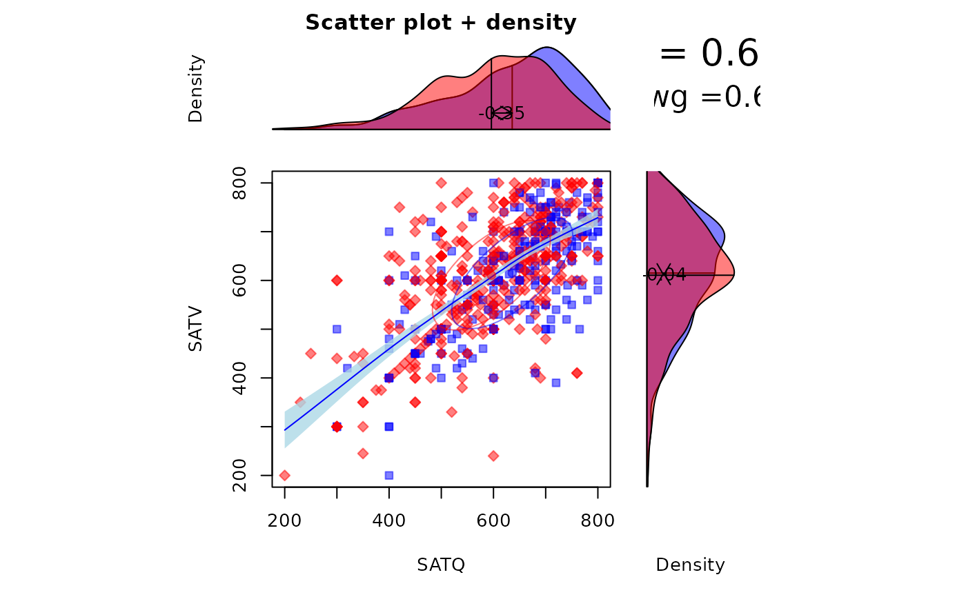scatterHist(SATV ~ SATQ + gender,data=sat.act) #formula input with a grouping variable