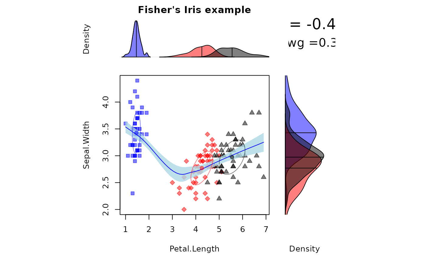 scatterHist(x,y=NULL,smooth=TRUE,ab=FALSE, correl=TRUE,data=NULL, density=TRUE,means=TRUE,