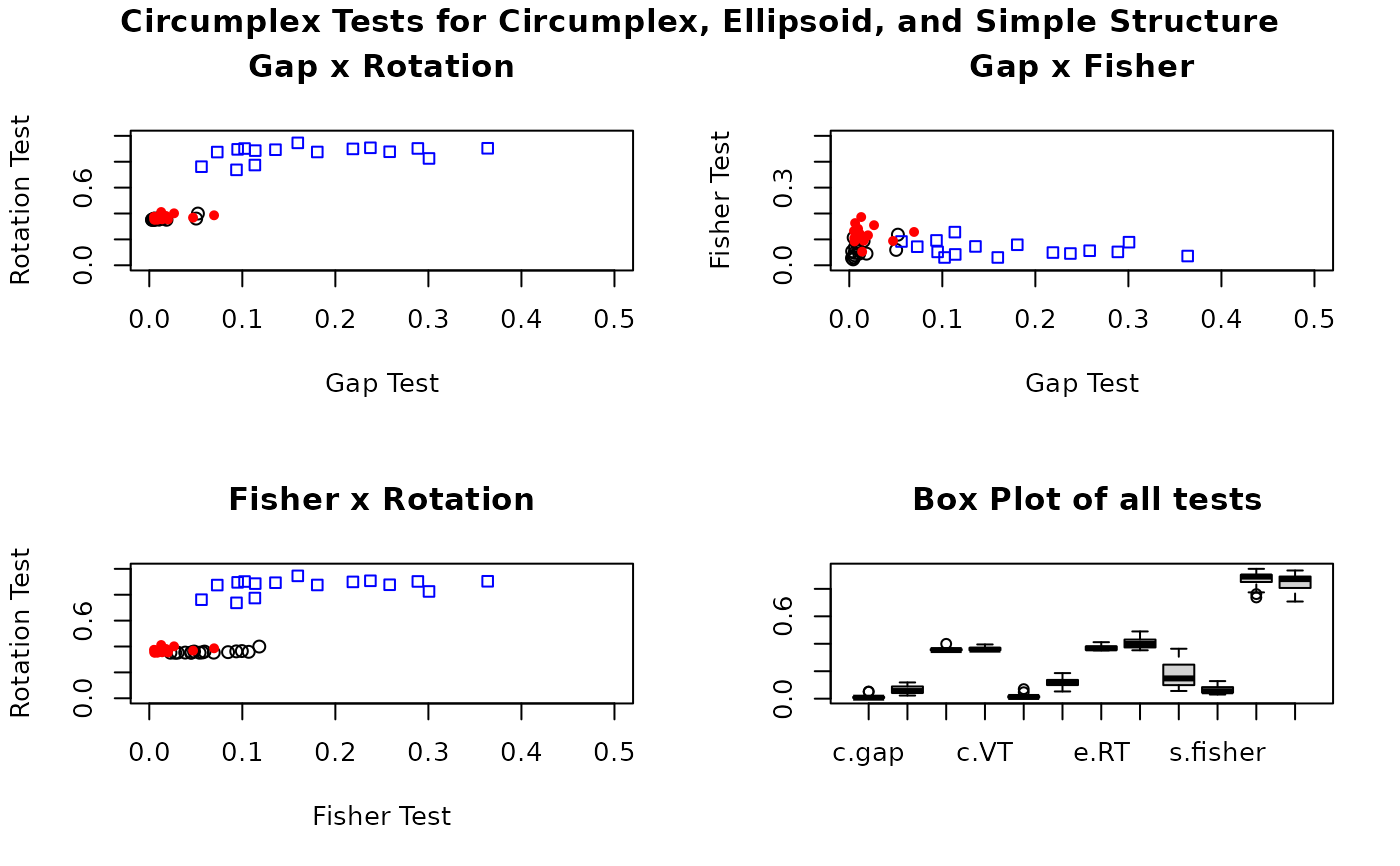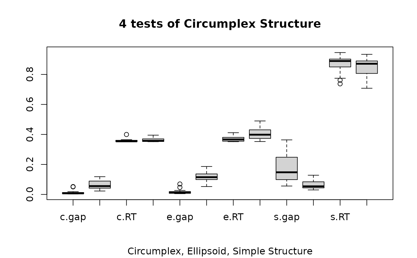 title("4 tests of Circumplex Structure",sub="Circumplex, Ellipsoid, Simple Structure")