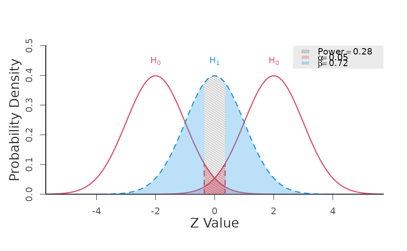 power.z.test(mean = 0, null.mean = c(-2, 2), alpha = 0.05,