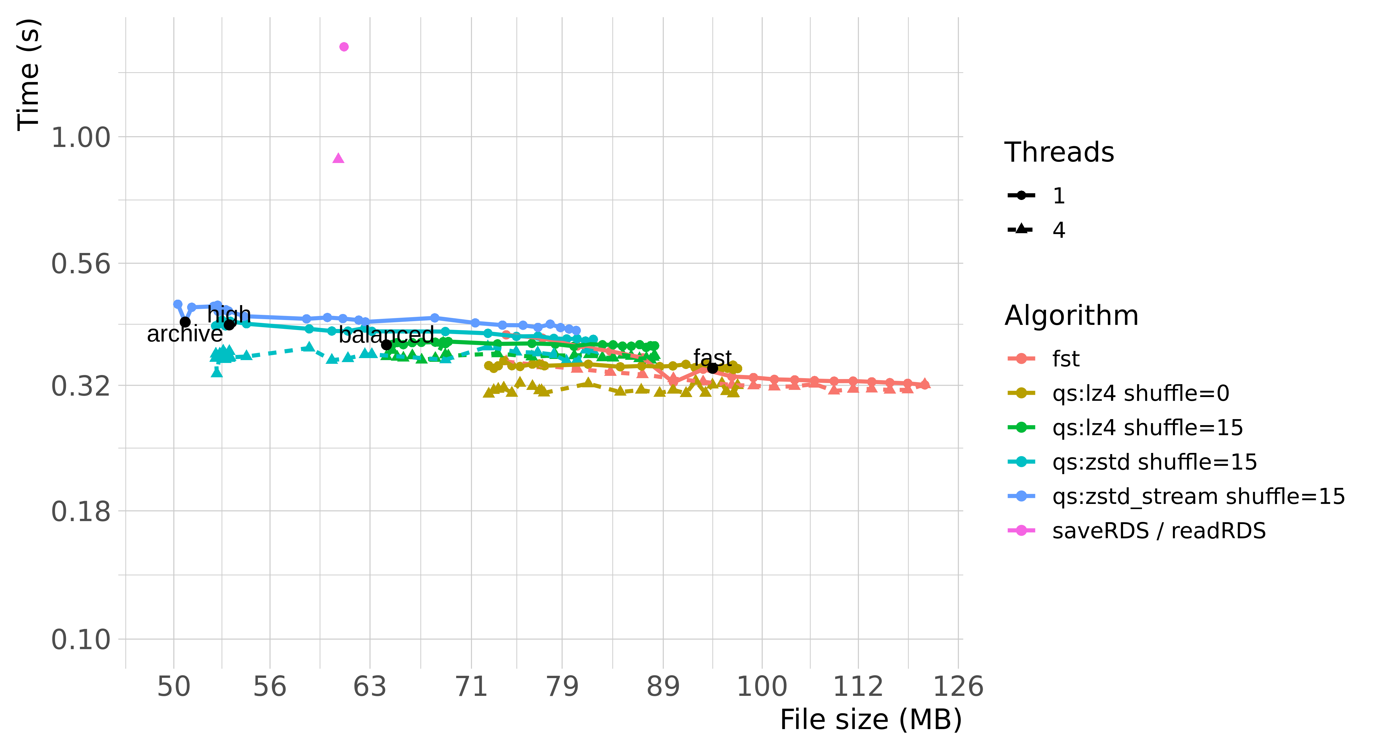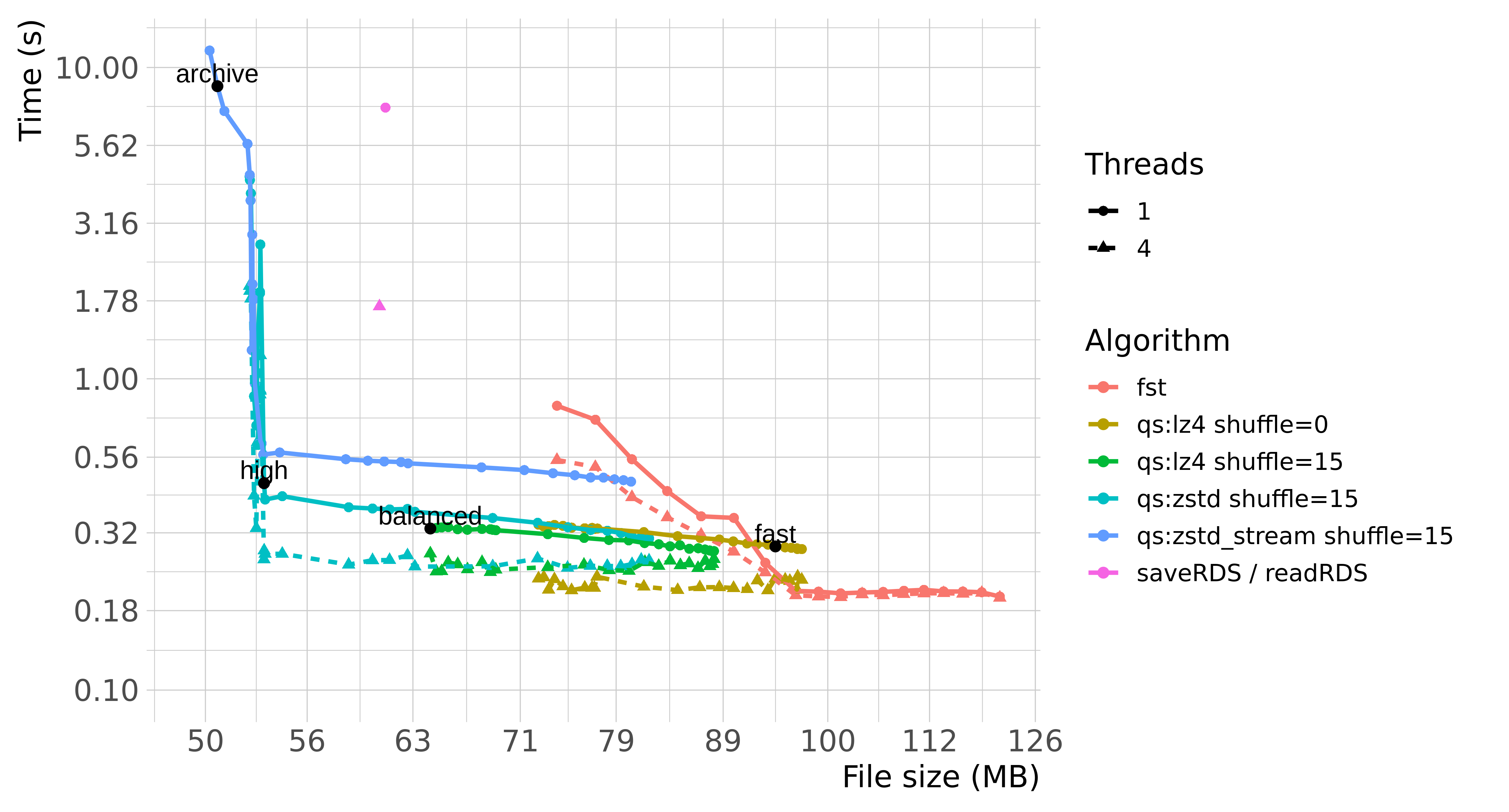 stringsAsFactors = F)qs is highly parameterized and can be tuned by the user to extract as much speed and compression as possible, if desired. For simplicity, qs comes with 4 presets, which trades speed and compression ratio: “fast”, “balanced”, “high” and “archive”.