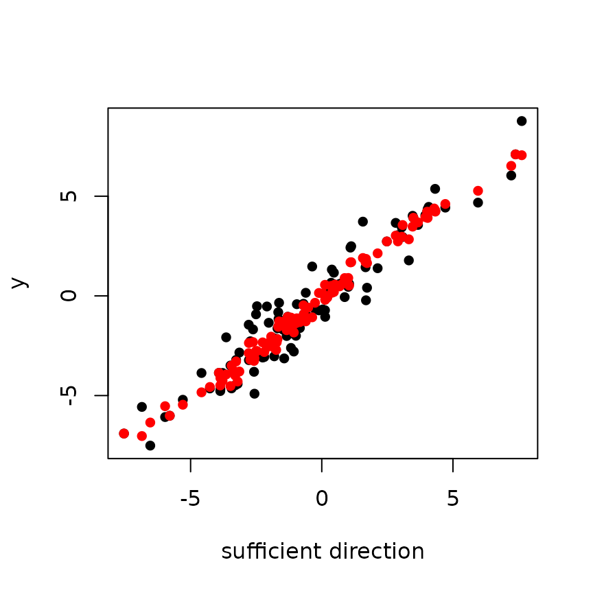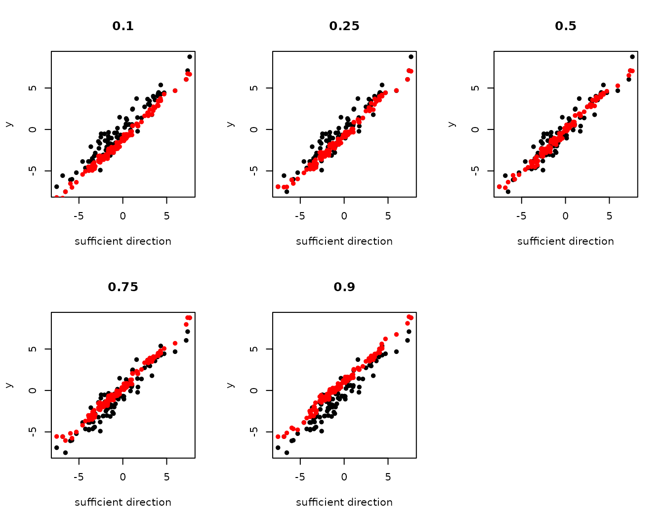 plot(true_dir, y, xlab = "sufficient direction", ylab = "y", main = taus[i], pch = 16)