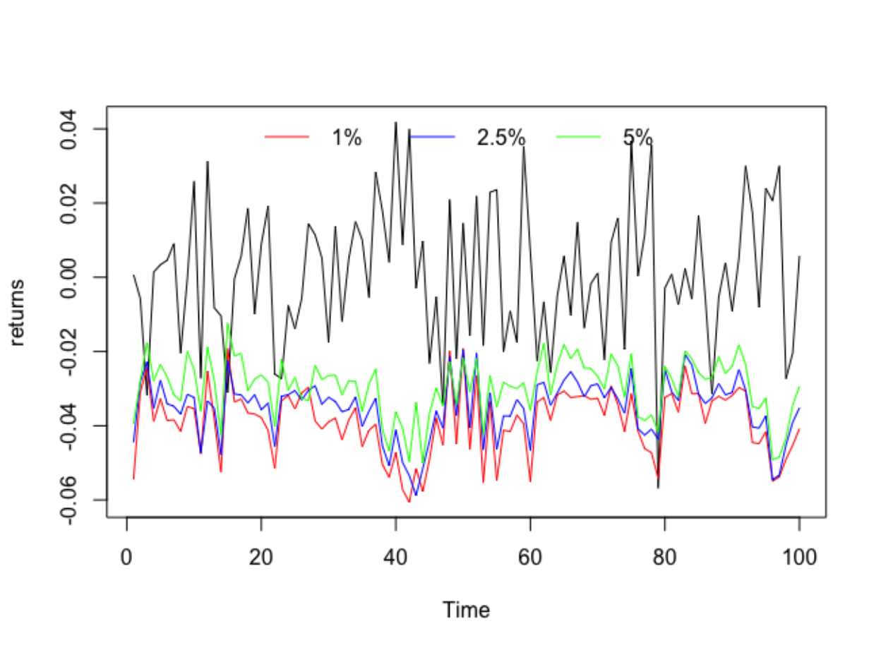 #> VaR -0.03148For illustration purposes, we will use the last 100 observations as a testing data set for one-step ahead VaR estimation and the rest of the observations as historical data. Specifically, for each of the time points, , of the observations not included in the historical data, we estimate the model based on all of the data up to time and report the 5% VaR.