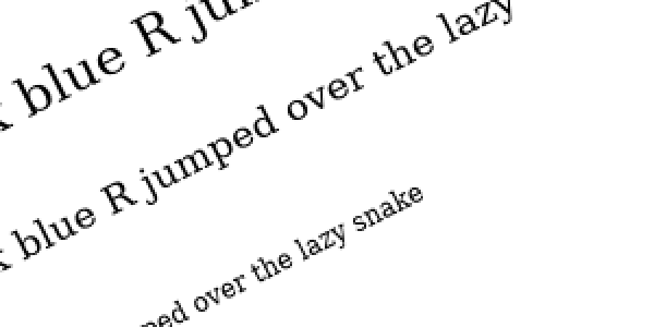 Text is a difficult thing to handle for a graphic device, both in terms of finding system fonts, and in terms of rendering. Often the rendering is offloaded to another library (e.g. freetype), which will provide a bitmap representation to blend into the device. This approach is often good for horizontal or vertical text, but struggle with other rotations. Here we will test text rendering at different sizes and at a 27° counter-clockwise rotation. We will use the the system provided serif font as it provides a more complex task than a sans-serif one.