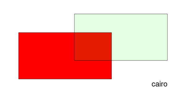 How transparent colours are combined is not necessarily equal among devices. The biggest divide is on whether to use premultiplied colours or not. With premultiplied colours the red, green, and blue intensity is weighted by the alpha directly, instead of alpha simply being an additional value. Using premultiplied colours is the only way to get correct alpha blending. As the Xlib device doesn’t support transparent colours it will be exempt from this comparison even on systems that have it. Further, as alpha blending is not related to anti-aliasing, we will simply compare ragg against a single cairo setup.