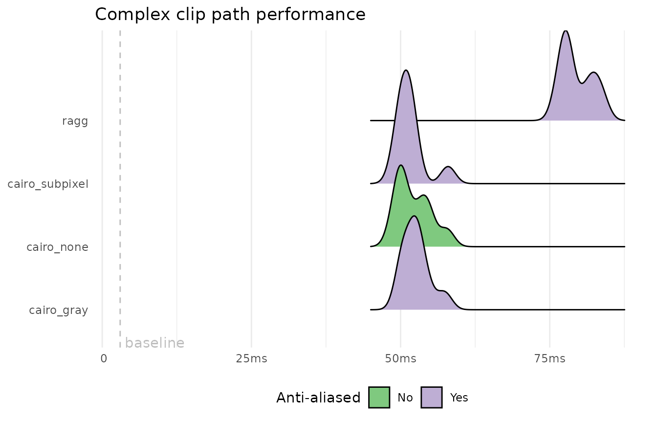 We can see that ragg fares much better than cairo when it comes to rendering with arbitrary clipping paths. I can’t comment on how the cairo implementation works, but ragg is able to perform the clipping at the rasterisation level rather than performing boolean operations on the geometries which makes it very efficient as it basically surmounts to rasterising the clipping path in those areas where the main graphic is getting rendered.