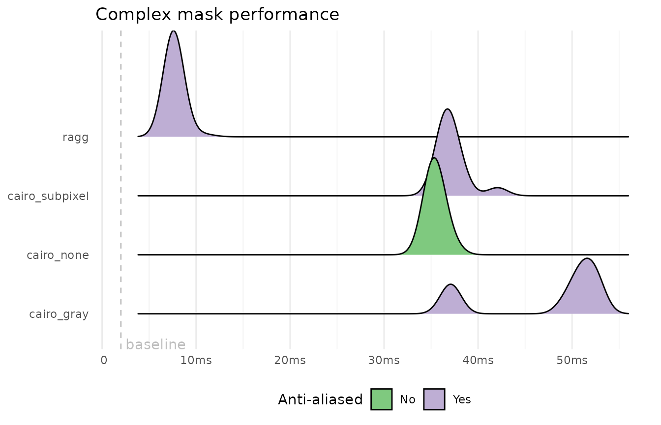 We see that, at least at the resolutions these tests are performed at, alpha masks are much faster than clipping paths for both ragg and cairo - ragg is still quite a bit faster, but cairo’s mask performance is faster than ragg’s clipping path performance.