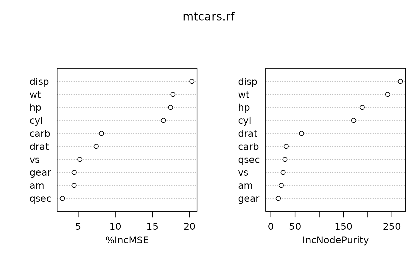 mtcars.rf <- randomForest(mpg ~ ., data=mtcars, ntree=1000, keep.forest=FALSE,