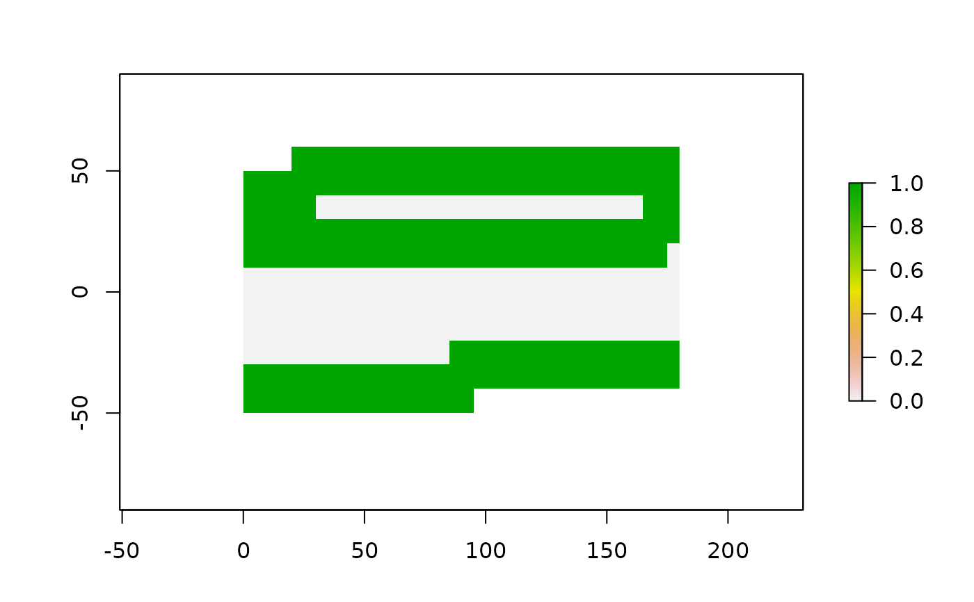 RasterLayer. Cell values are either 1 (a border) or 0 (not a border), or NA