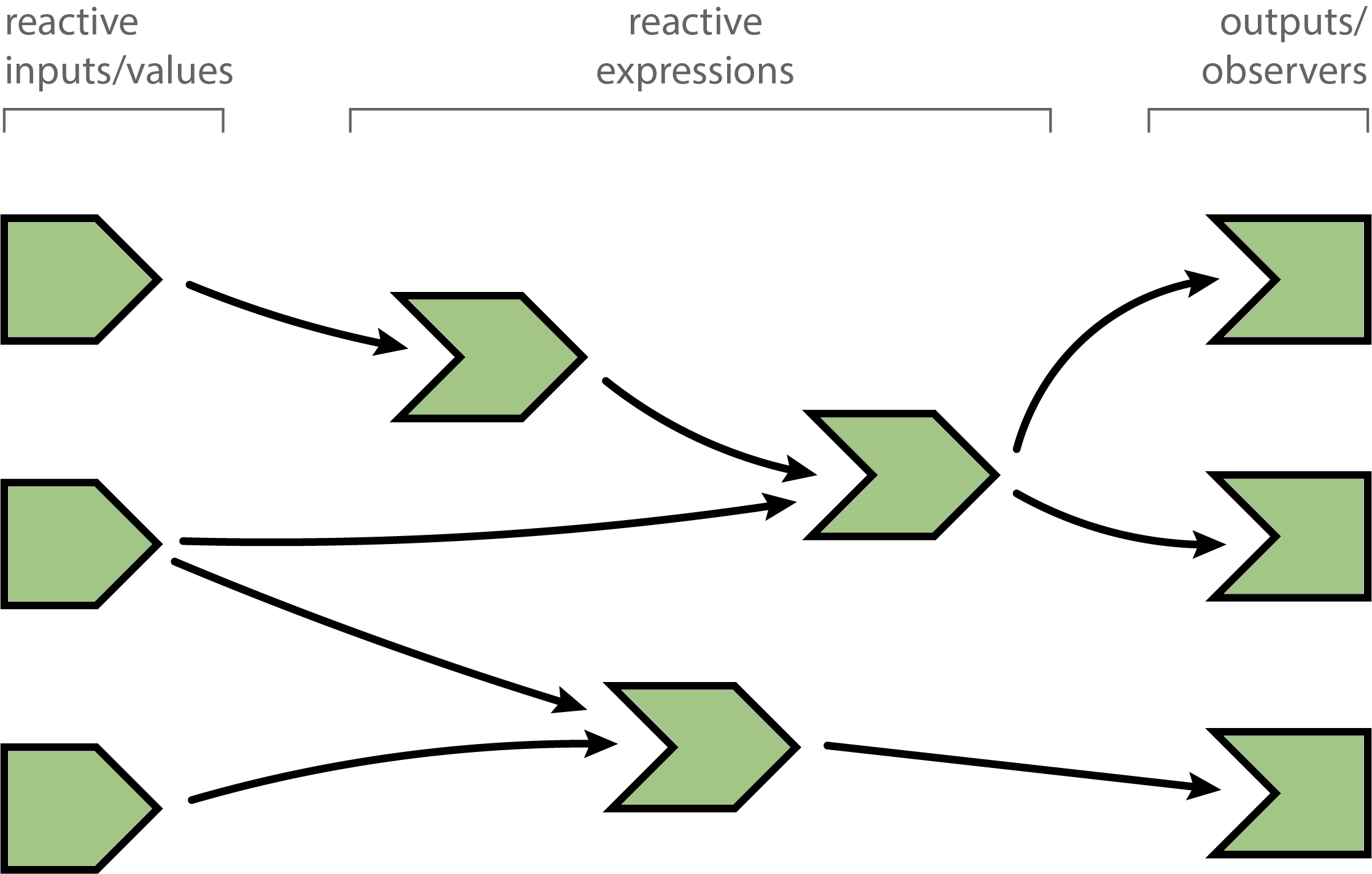 Let’s stop here for just a moment and think about what we’ve done. We’ve read some inputs, calculated some values, and generated some outputs. But more importantly, in the course of doing that work, we also discovered the relationships between these different calculations and outputs. An arrow from a reactive input to a reactive expression tells us that if the reactive input’s value changes, the reactive expression’s result value can no longer be considered valid. And an arrow from a reactive expression to an output means that if the reactive expression’s result is no longer valid, then the output’s previous result needs to be refreshed.