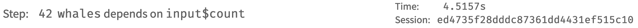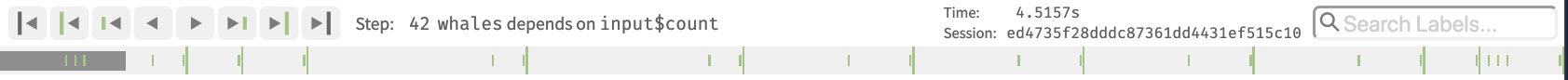 For more complex graphs, like the one created by Joe Cheng’s cranwhales app, it’s convenient to have more advanced navigation through the time-dependent graph, like jumping to the next idle step using , and querying sub-graphs by double-clicking and/or searching for graph components by name. Also, notice how, upon opening reactlog, it navigates to the first reactive flush (i.e., completion of the first round of reactive execution). If there is a particular round of execution you’re primarily interested in, you can add user mark(s), and reactlog would open to that time point instead (see Navigation for more details on creating and navigating to user marks).