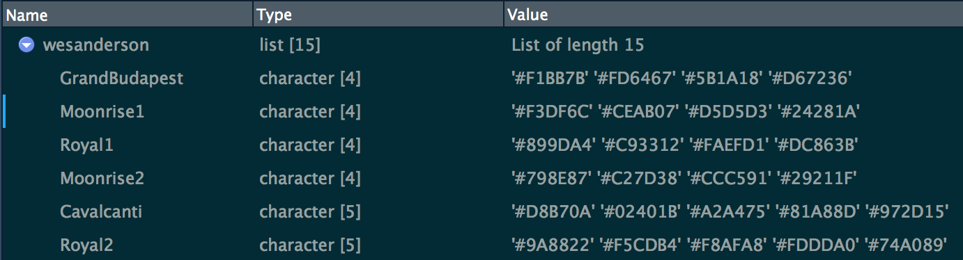 #> "#446455, #FDD262, #D3DDDC, #C7B19C"The same wesanderson data is also present as JSON and