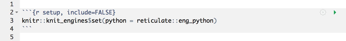 If you are using knitr version 1.18 or higher, then the reticulate Python engine will be enabled by default whenever reticulate is installed and no further setup is required. If you are running an earlier version of knitr or want to disable the use of the reticulate engine see the Engine Setup section below.