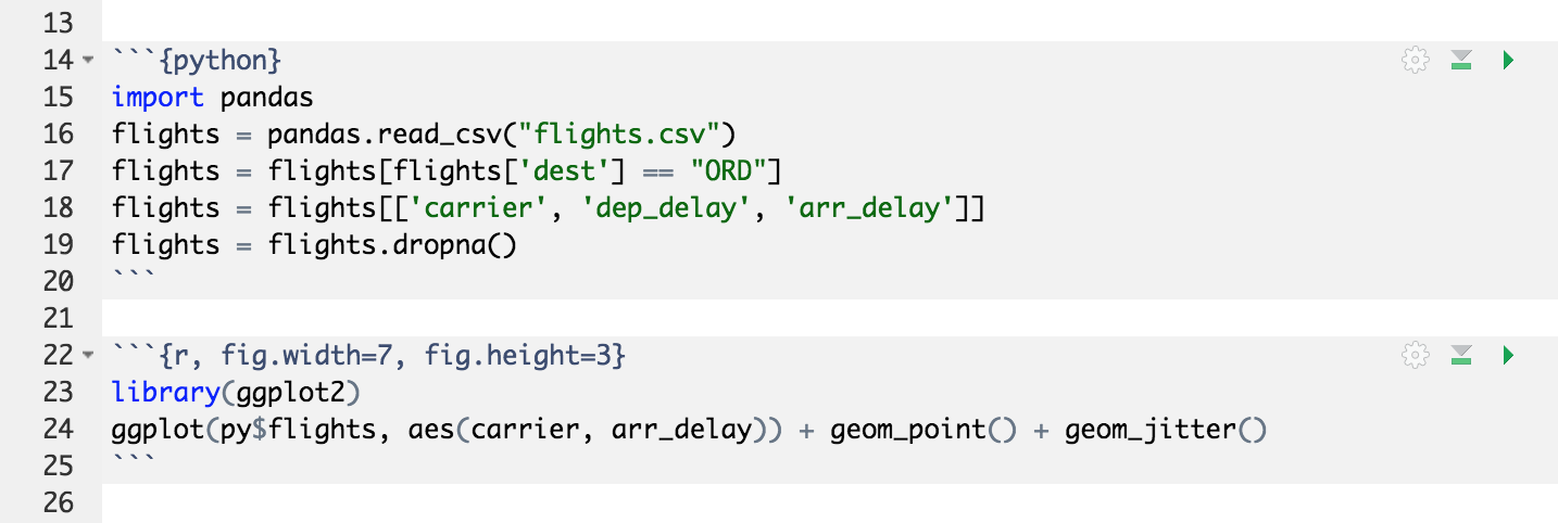 Python chunks behave very similar to R chunks (including graphical output from matplotlib) and the two languages have full access each other’s objects. Built in conversion for many Python object types is provided, including NumPy arrays and Pandas data frames.