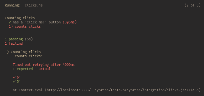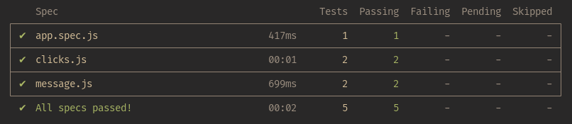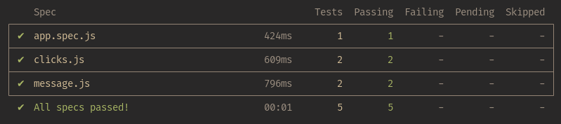 });Now, run your tests. You should see something similar to this (you might have noticed that now clicking test took more time than previously - that’s because the clicking finally happened):