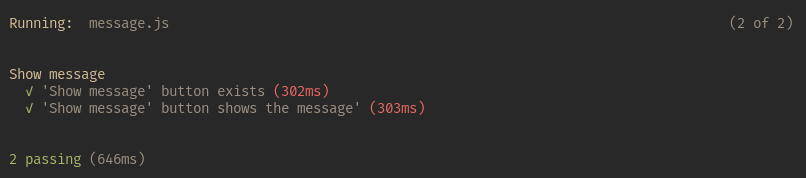 });As you can see, we are going to write two tests - the first one to check if the button exists and the second to check if it works properly and shows the message.