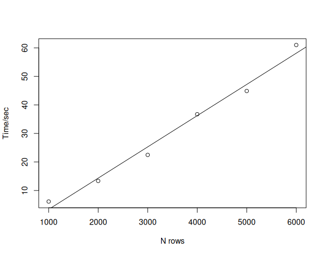 It is obvious that the time consumption grows linearly as the rows of data increase.