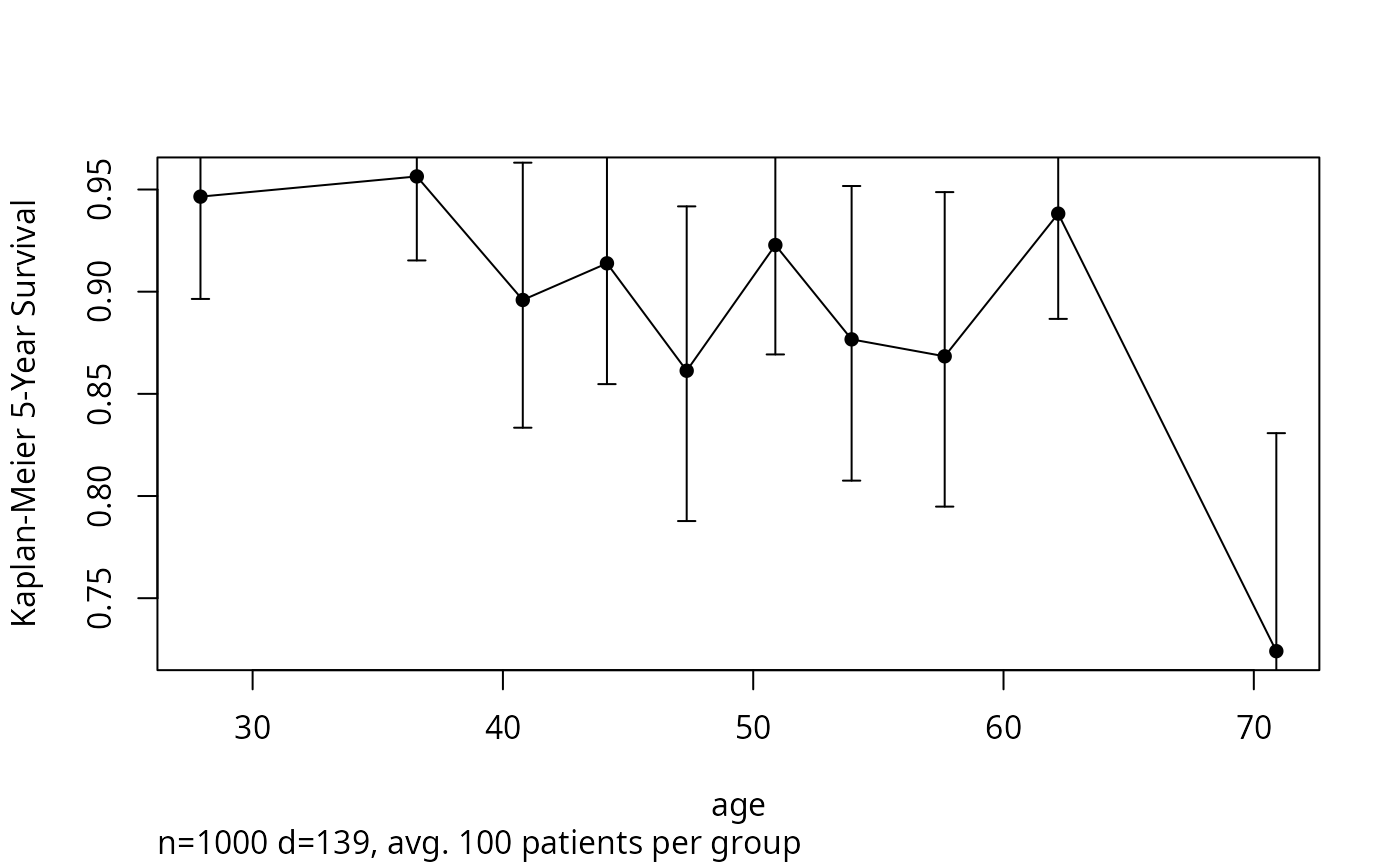 groupkm(age, Surv(d.time, e), g=10, u=5, pl=TRUE)