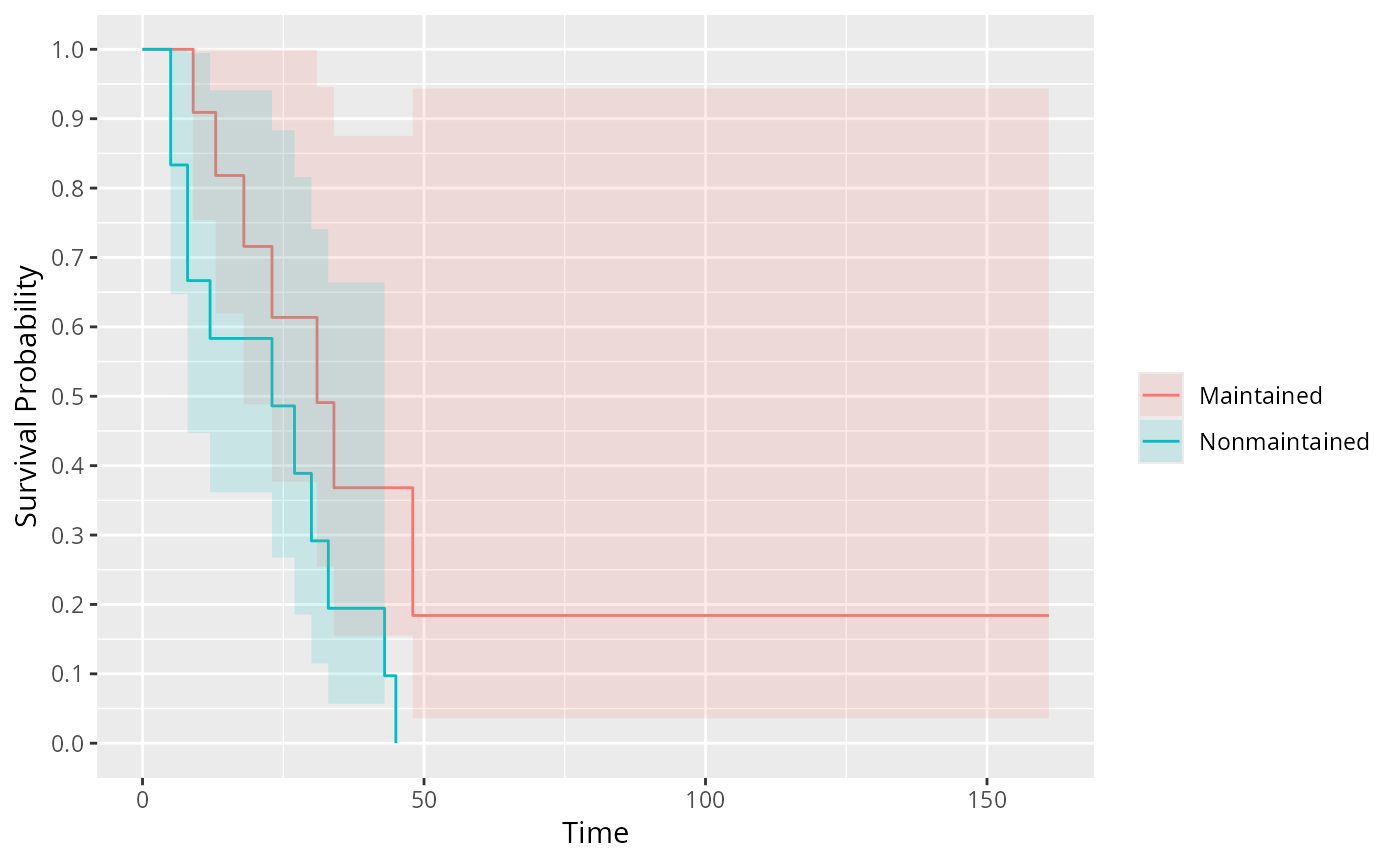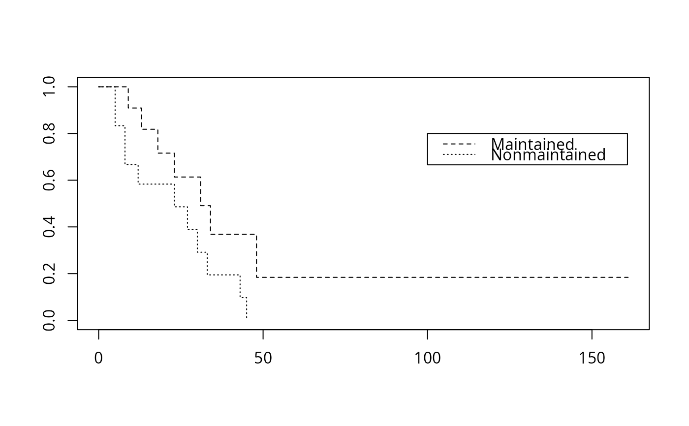 legend(100, .8, c("Maintained", "Nonmaintained"), lty = 2:3)