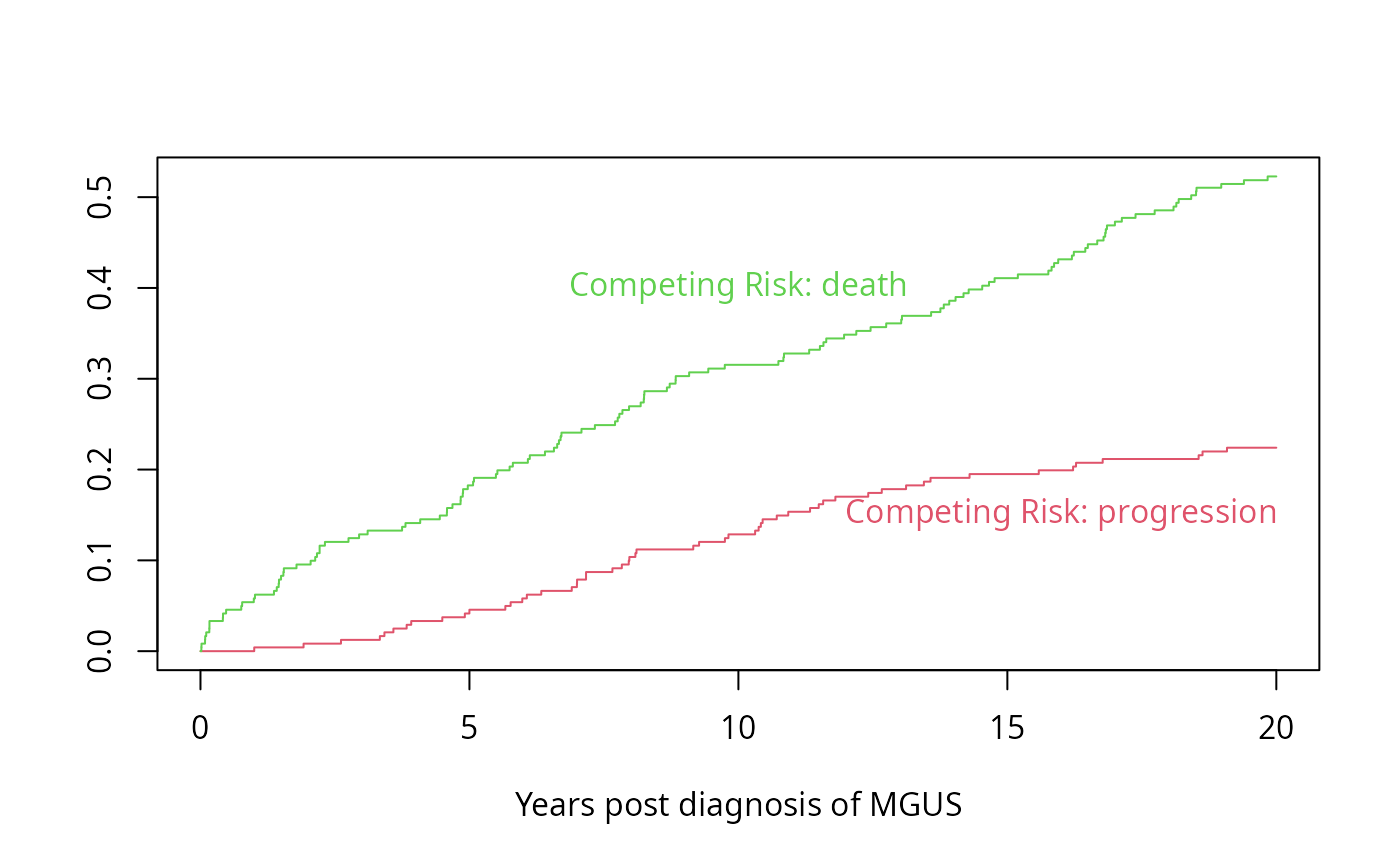col=2:3, xlab="Years post diagnosis of MGUS")