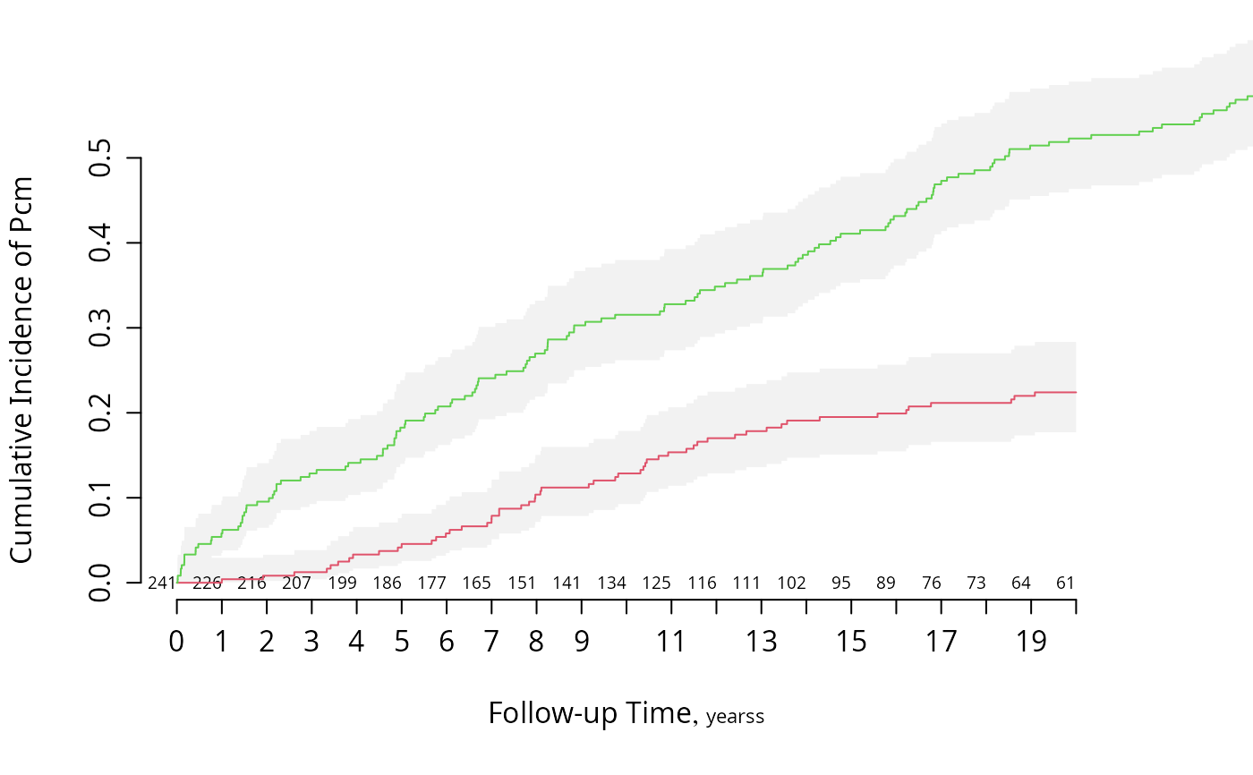 survplot(f, state='pcm', n.risk=TRUE, xlim=c(0, 20), ylim=c(0, .5), col=2)