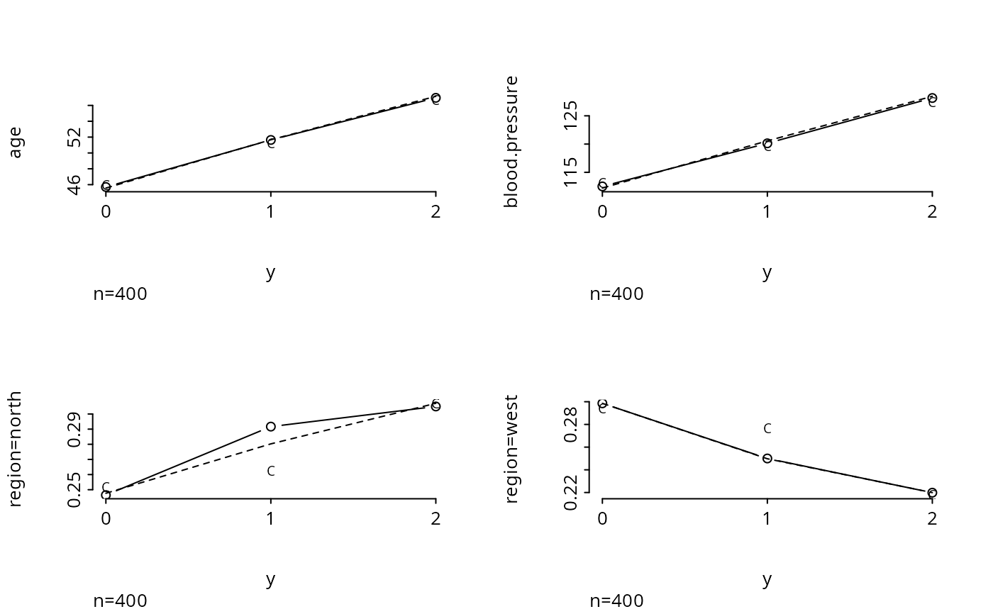 plot.xmean.ordinaly(y ~ age + blood.pressure + region, cr=TRUE, topcats=2)