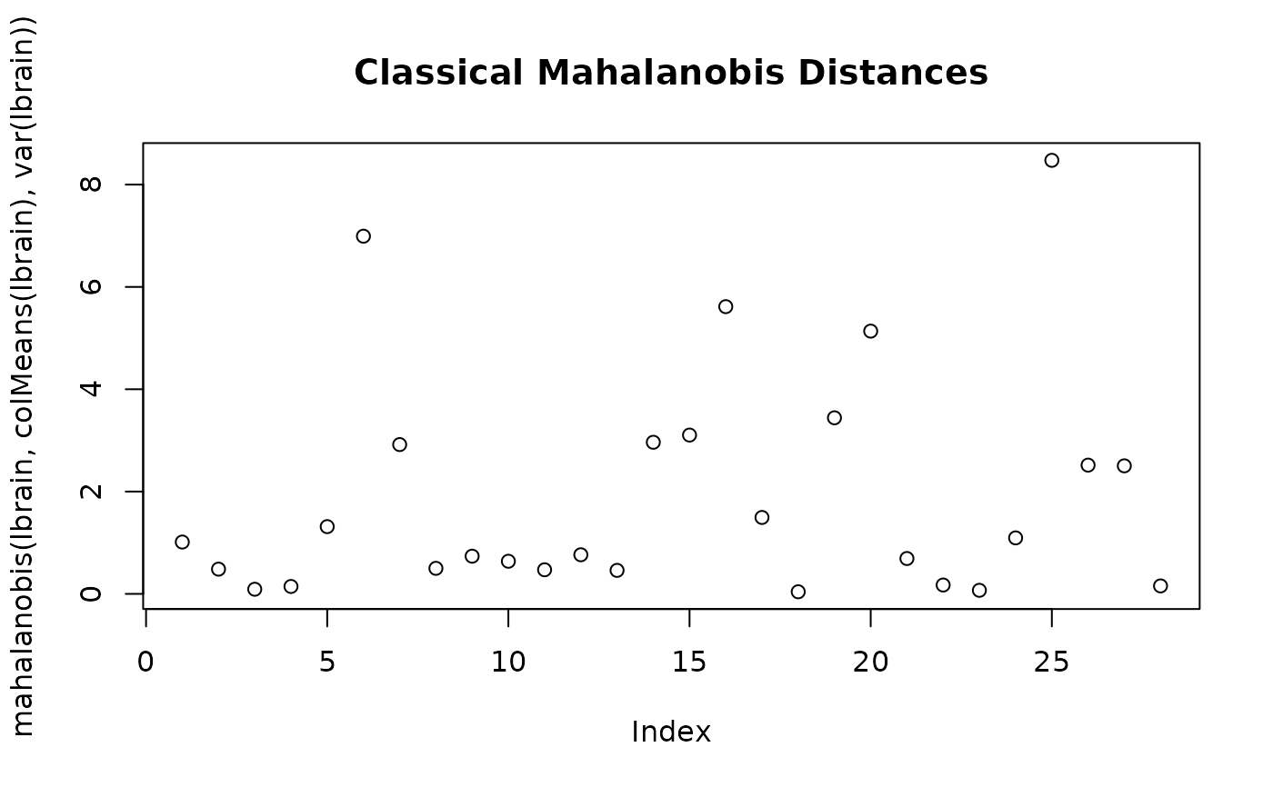 plot(mahalanobis(lbrain, colMeans(lbrain), var(lbrain)),