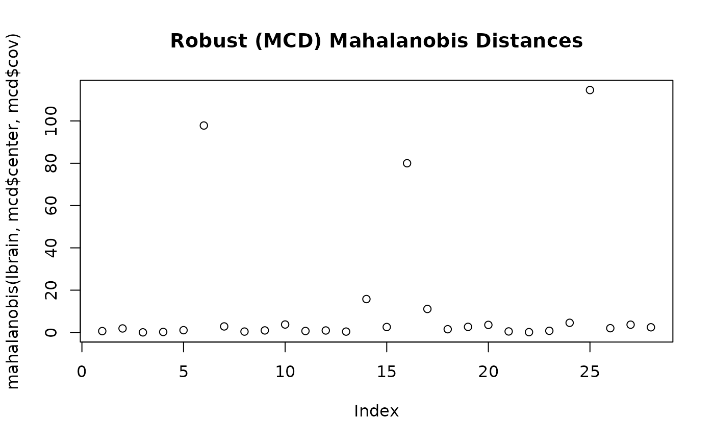 plot(mahalanobis(lbrain,mcd$center,mcd$cov),