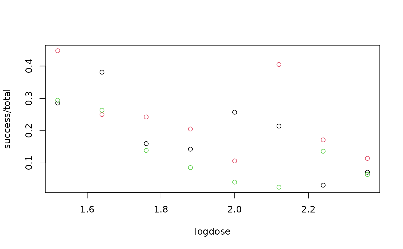 plot(success/total ~ logdose, data = carrots, col = as.integer(block))