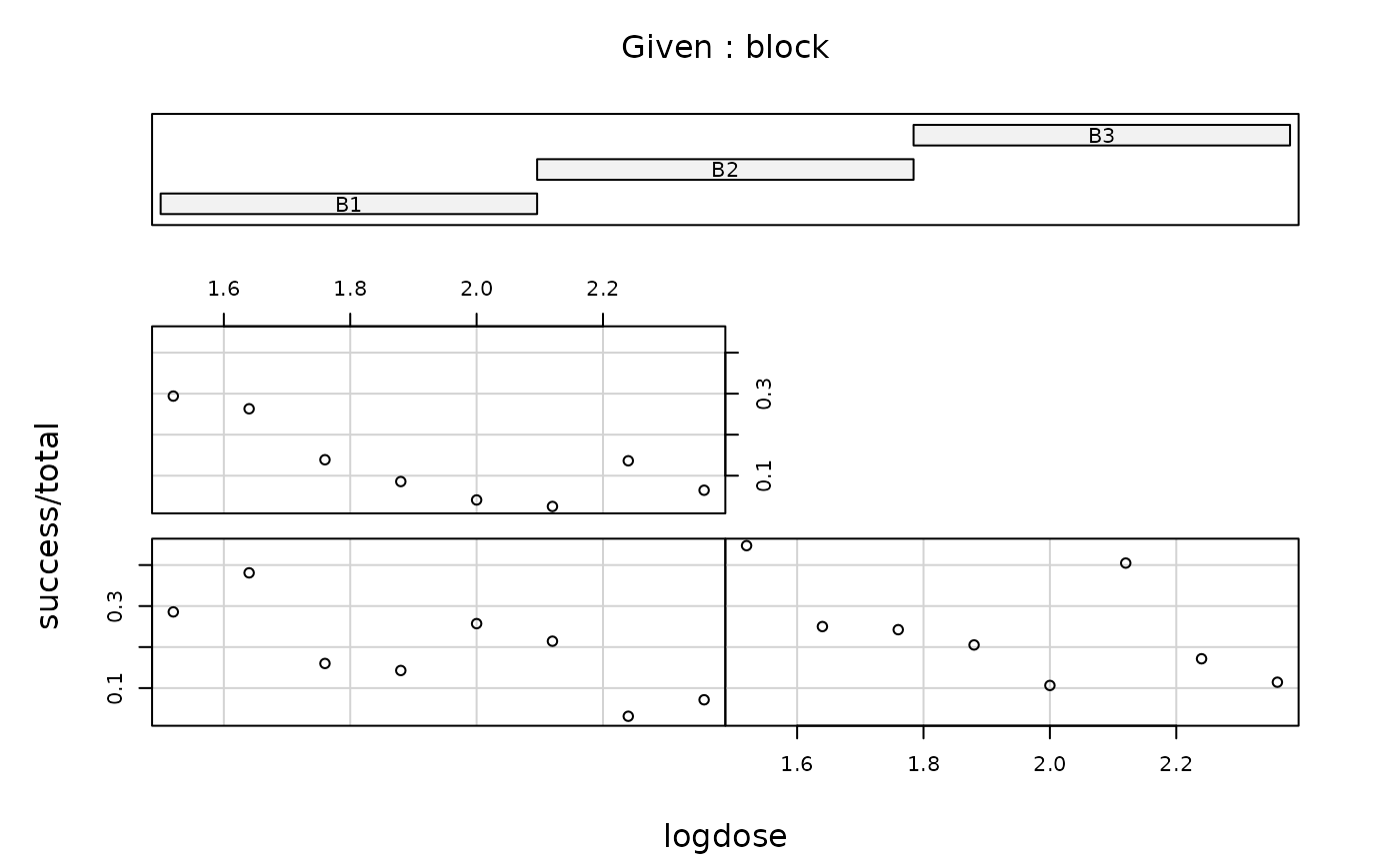 Cfit0 <- glm(cbind(success, total-success) ~ logdose + block,