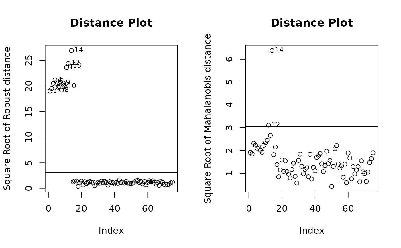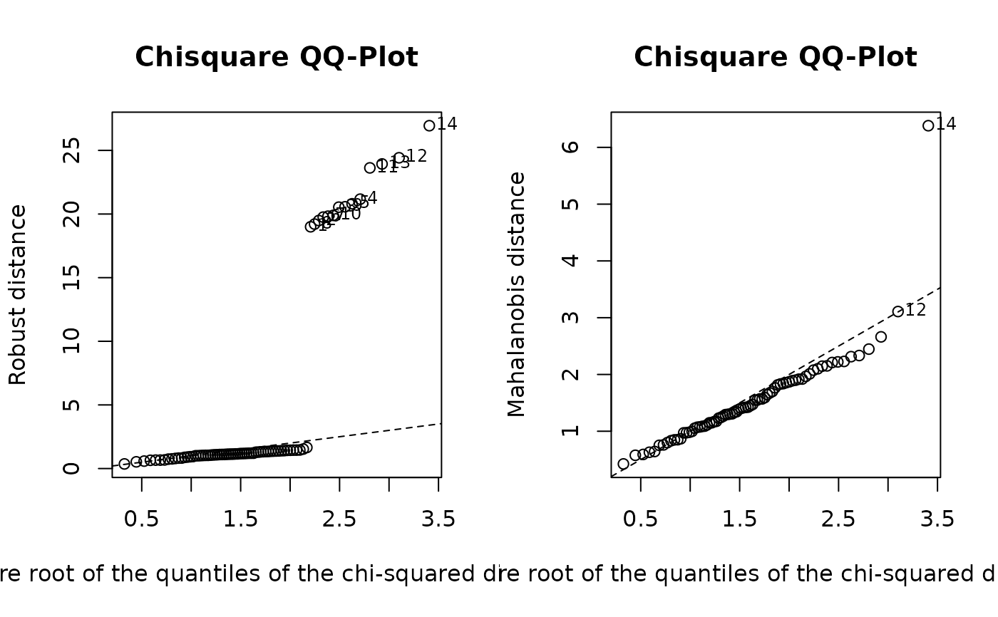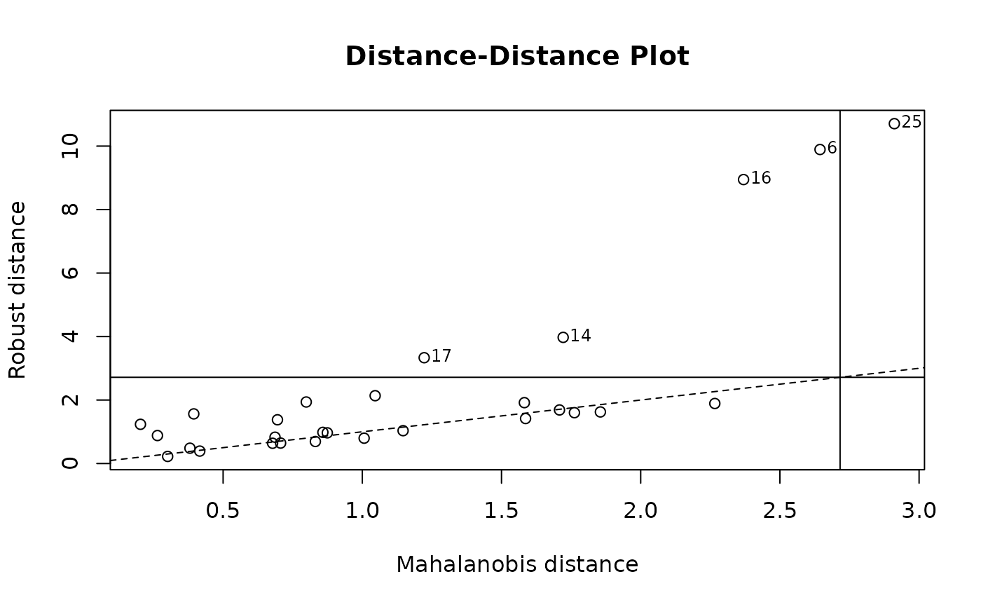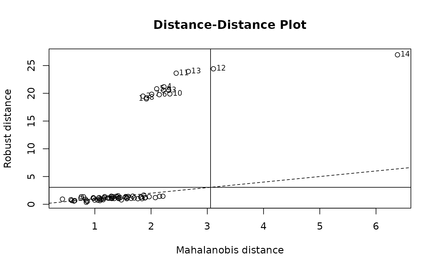 The Distance-Distance Plot, introduced by Rousseeuw and van Zomeren (1990), displays the robust distances versus the classical Mahalanobis distances. The dashed line is the set of points where the robust distance is equal to the classical distance. The horizontal and vertical lines are drawn at values equal to the cutoff which defaults to square root of the 97.5% quantile of a chi-squared distribution with p degrees of freedom. Points beyond these lines can be considered outliers.