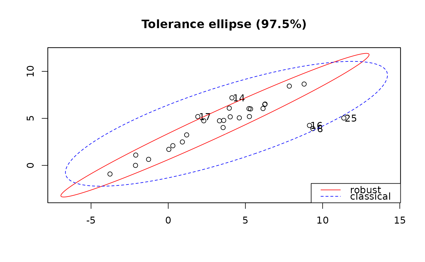 plot of the tolerance ellipses (robust and classic)