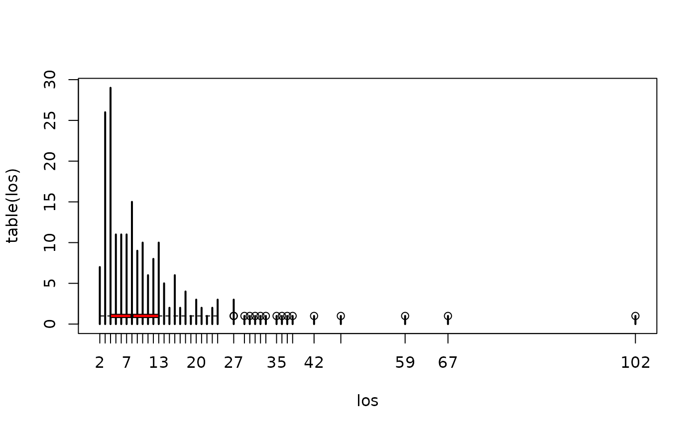 boxplot(los, add = TRUE, staplewex= 0.2, outcex= 0.5, outpch= 4,