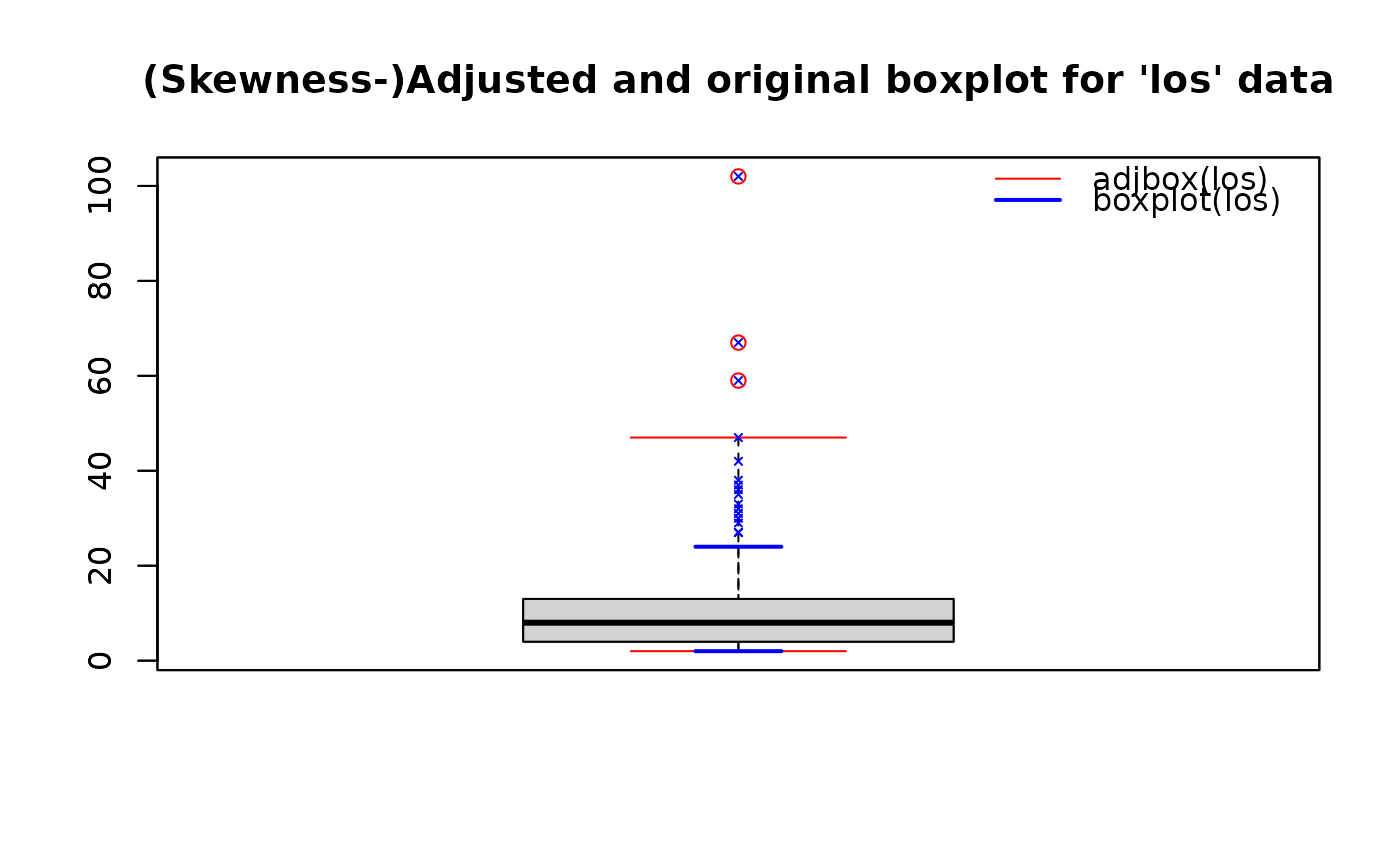 main = "(Skewness-)Adjusted and original boxplot for 'los' data")